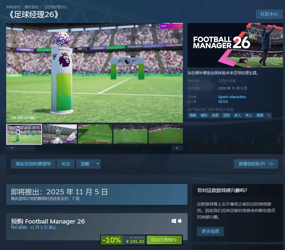 从Steam界面可以看到,FM26已经开始预售,预约购买可以获得10%的折扣。折扣后本体的价格为241.2元。